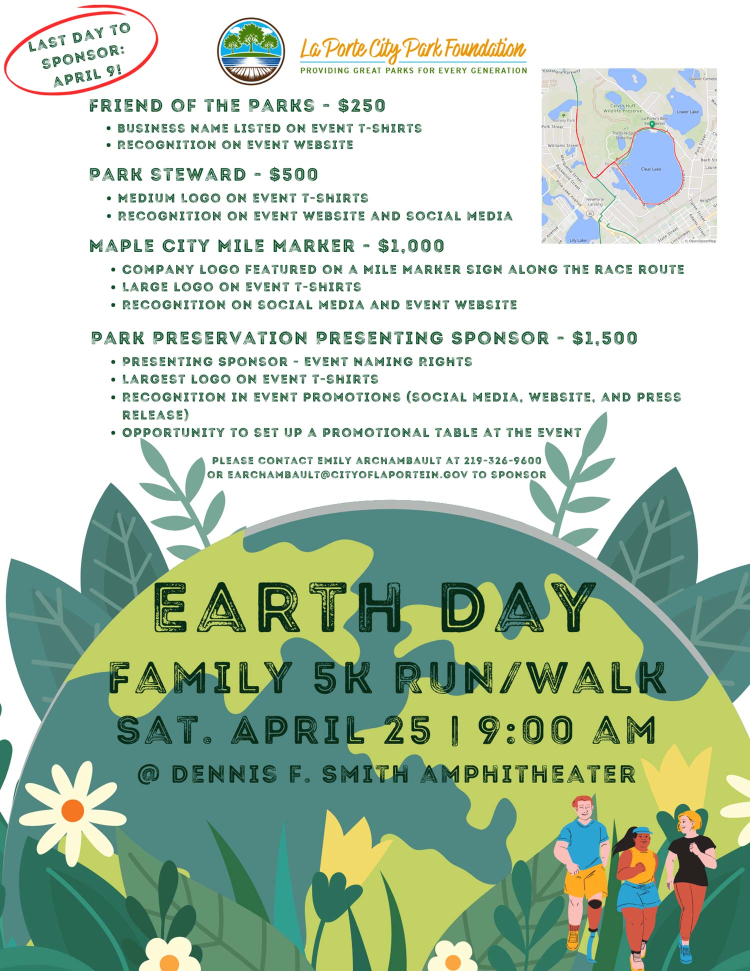 We’re excited to announce that the Earth Day 5K and Family Fun Run/Walk will return on Saturday, April 25, 2026! Join us for a fun-filled day of fitness, nature, and community spirit as we raise funds to support the La Porte Park Foundation. Whether you’re a seasoned runner, casual walker, or just looking to spend quality time with family, this event is the perfect way to celebrate Earth Day and show your love for our local parks.